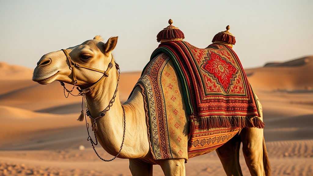 - Intricate fur patterns, tassels, and bells adorn the camels for the event.