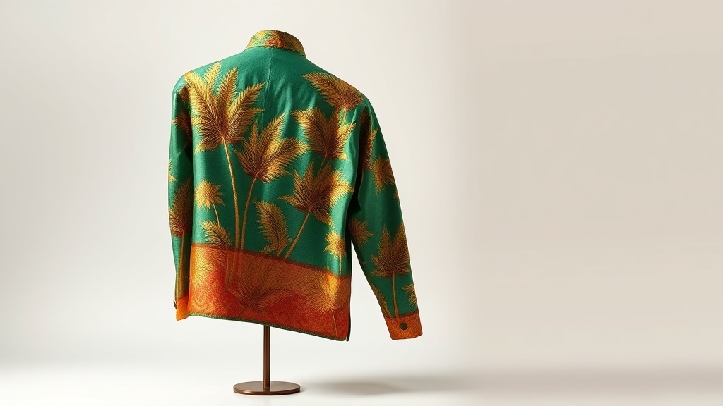• She wore a Banarasi silk jacket with tropical motifs and wide-leg trousers.